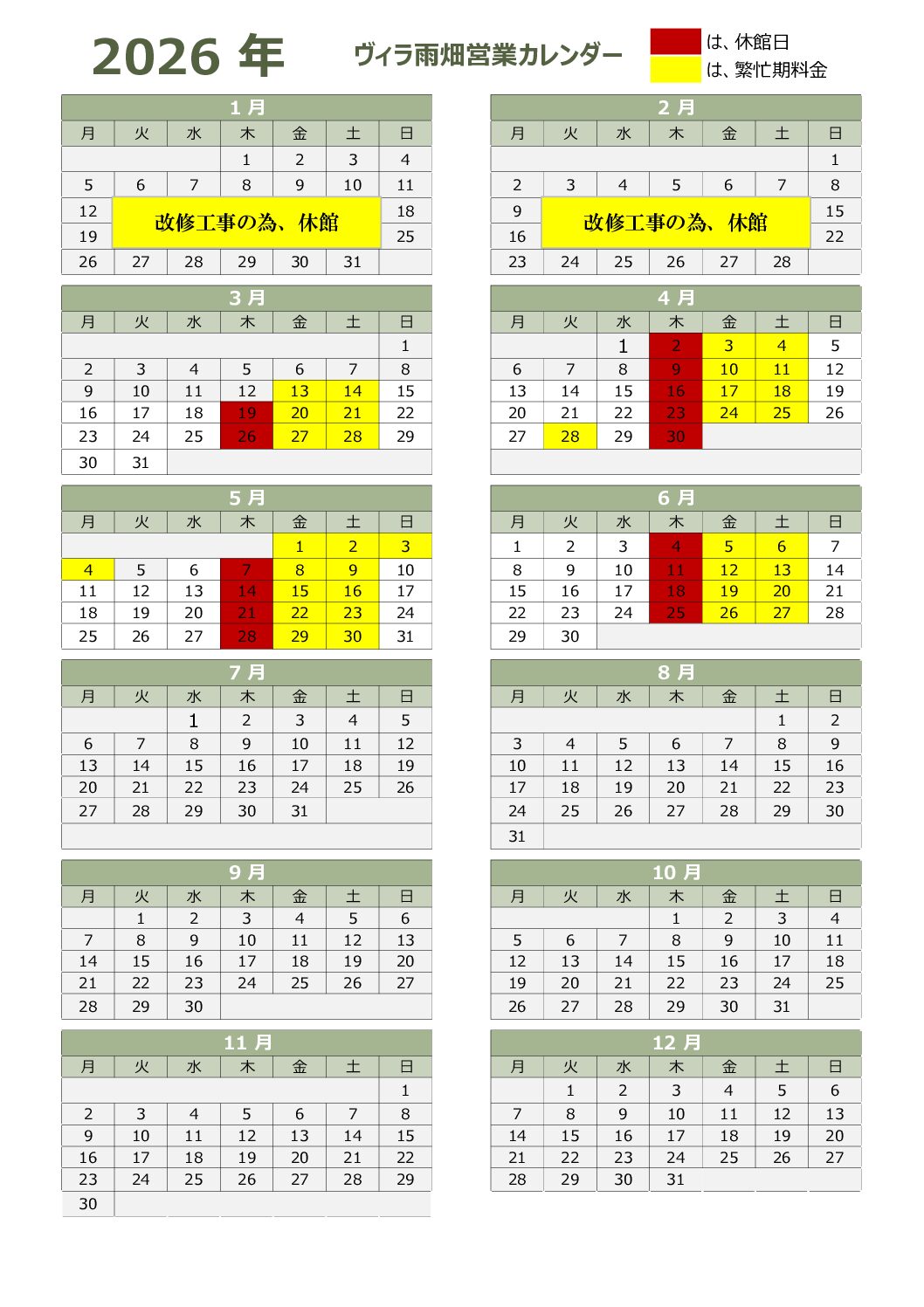 大変お待たせいたしました。R8(2026)年度4-6月の営業カレンダーが出来ました。ご予約、お問い合わせは、お電話でお願いいたします。